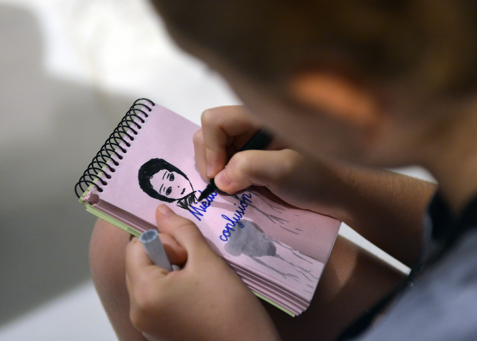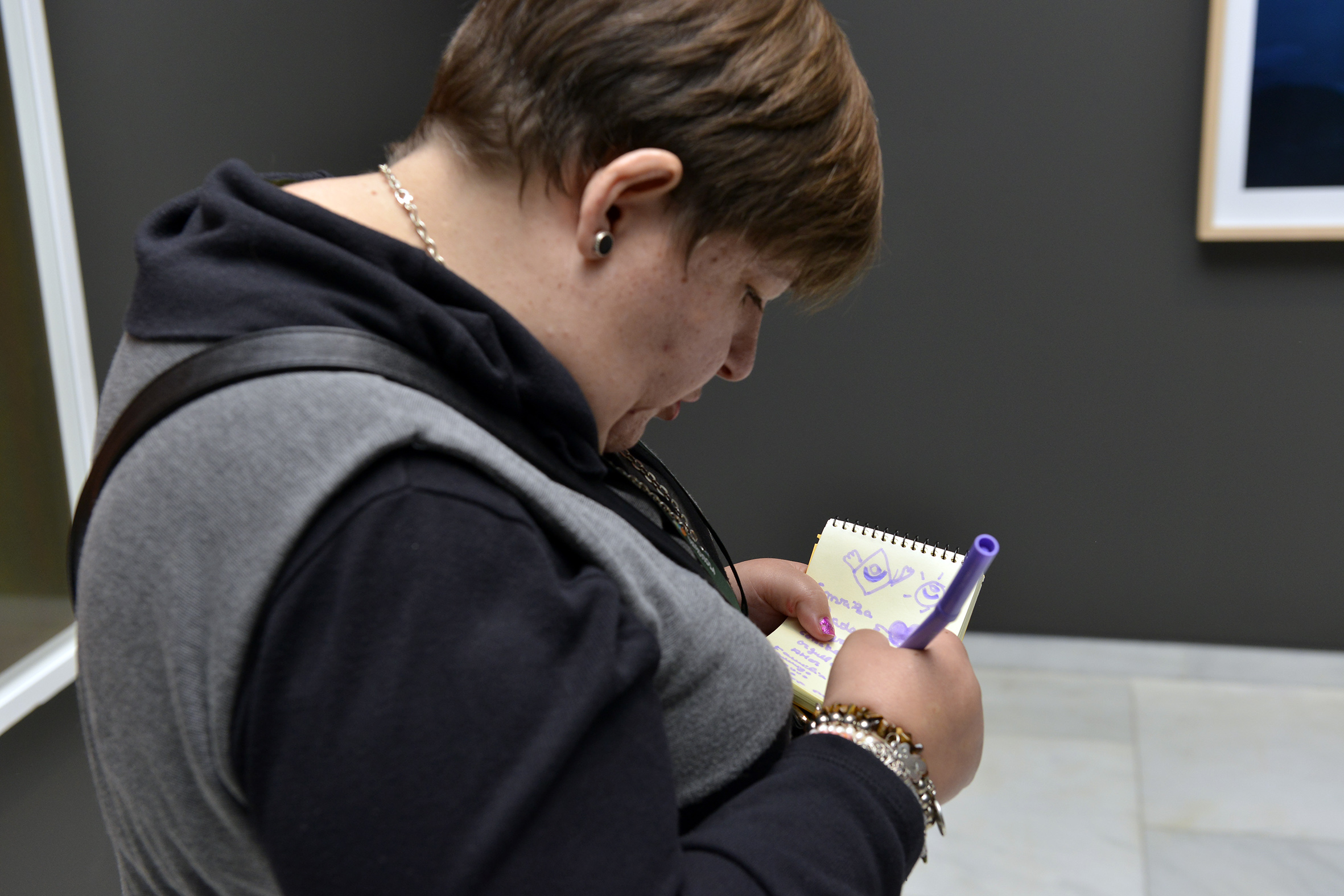 Cada uno de los participantes recibía un cuaderno donde anotaba sus emociones y sentimientos a través del dibujo o de la palabra libre. Las hojas de los cuadernos eran translúcidas permitiendo así las superposiciones de emociones, además de jugar con las palabras y el título de la exposición. Después de anotar las emociones y de forma voluntaria, se invitaba a mostrar al resto del grupo intentando motivar para crear un diálogo compartido. Los sentimientos y emociones se expresaban de forma voluntaria. Nunca se les obligaba, aunque sí se recordaba su uso en algunas obras concretas. Con estas dinámicas, la educadora se convertía en una acompañante de sensaciones a través de un modelo no directivo.