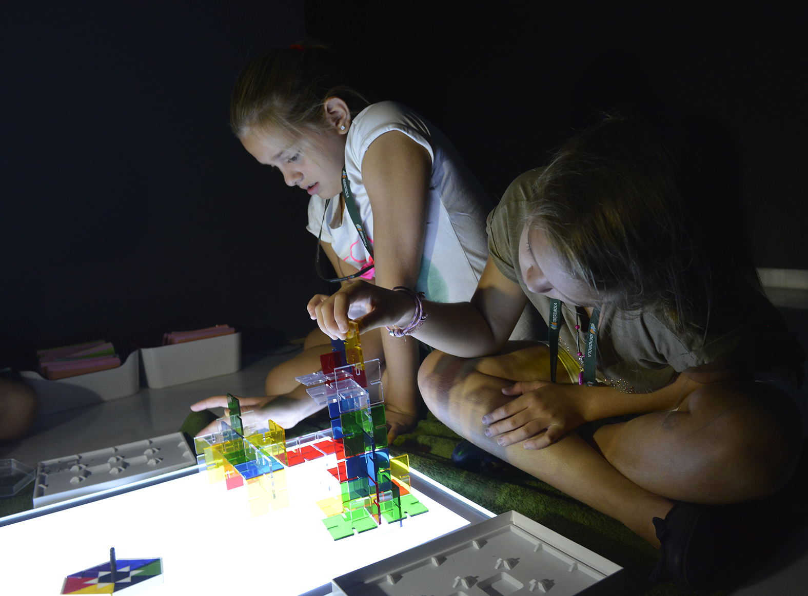 Dervish es una poética reflexión sobre el transcurso circular del tiempo y el desarrollo cambiante de la naturaleza que la artista Jennifer Steinkamp nos mostraba con una instalación visual situada en un espacio obscuro, escenario que se utilizó para jugar, construir, reconocer formas y mezclar colores con materiales de la naturaleza, bloques de madera, formas geométricas sobre una mesa de luces que utilizaba la última tecnología LED de baja energía para proporcionar una brillante iluminación de fondo limpio. Sobre esa mesa de luces también se jugó con una peonza de experimentación “prismo”, pequeños triángulos de colores muy variados que se colocan dentro del cuerpo de la peonza, generando, con su movimiento, infinitas combinaciones de colores y de luz.