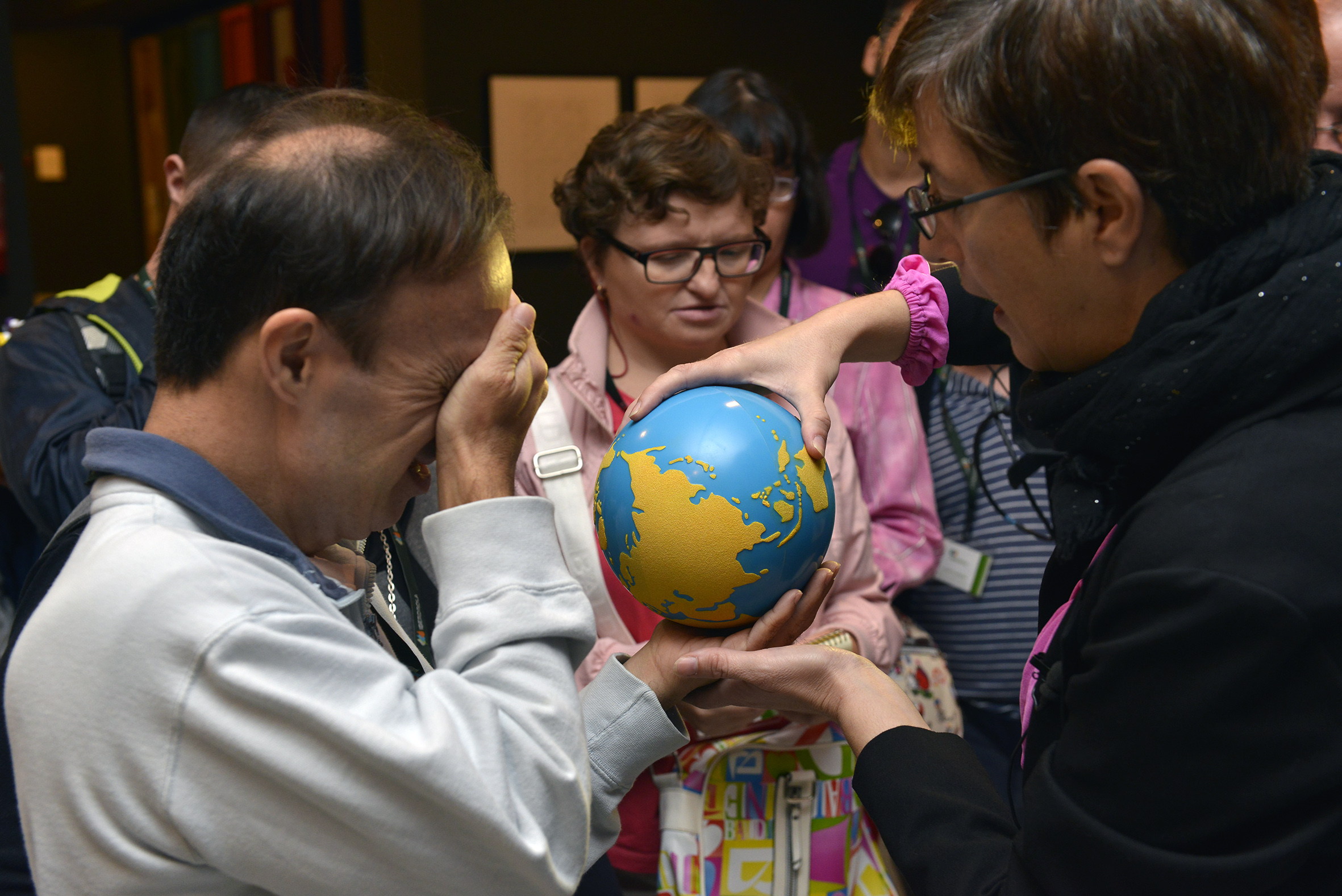 Una caja de telas y otra con materiales de la naturaleza (arena, hojas, ramas…) situadas frente a la matérica obra de Manolo Valdés permitía imaginar y sentir los diferentes materiales que este autor nos mostraba. Este ejercicio se realizaba con los ojos tapados para sentir primero la textura, imaginar y después ver la obra. Una bola del mundo con diferentes texturas permitía viajar por el mundo solo con los dedos mientras contemplábamos la obra atemporal de Juan Genovés y reflexionábamos sobre las migraciones y exilios. Estos ejercicios junto con el uso de la imaginación fueron las formas que se utilizaron para acercarse lo más posible al sentido del tacto.